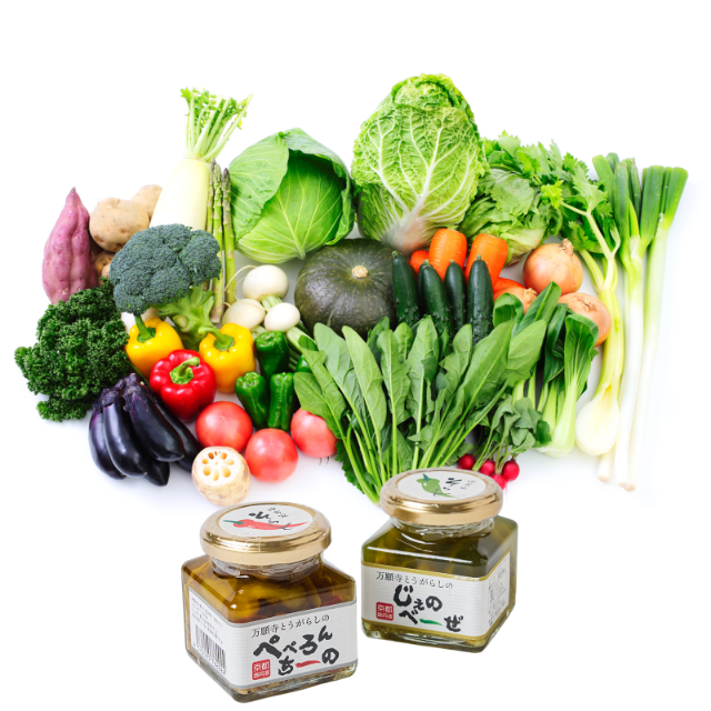 ・万願寺とうがらしのぺぺろんちーの 115g ・万願寺とうがらしのじぇのべーぜ 110g ・旬の野菜(天候状況によって内容が異なります) ※こちらは予約商品となります。10月下旬以降出荷準備が整い次第お届けいたします。 |