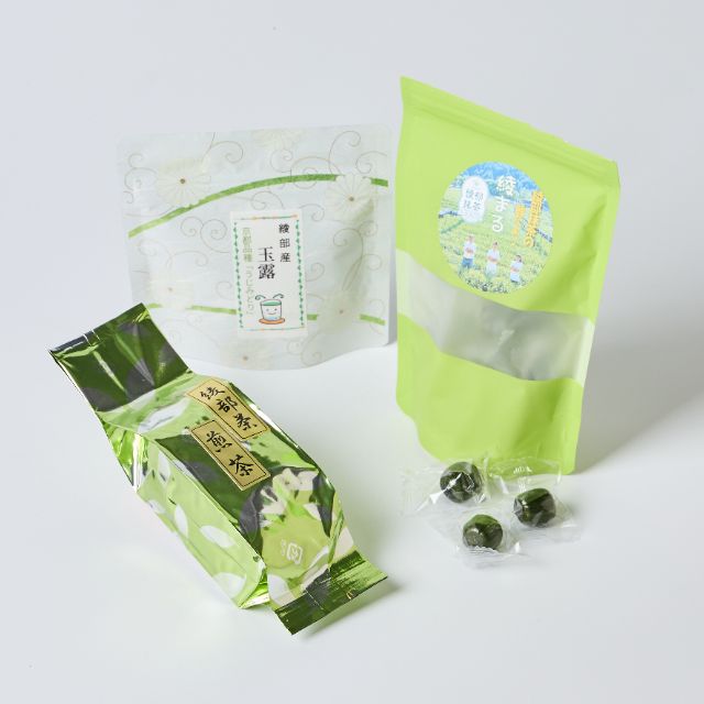 ・玉露(「うじみどり」もしくは「やぶきた」)30g ・煎茶 100g ・抹茶飴菓子 1袋(14個入) |