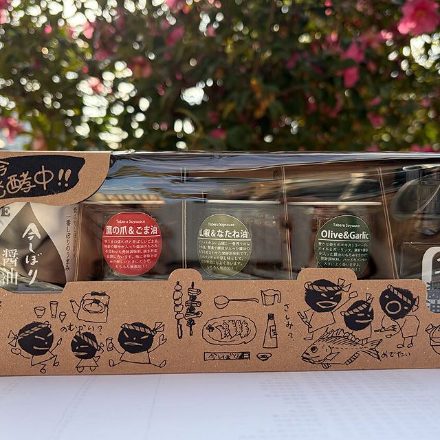 ・今しぼり醤油(2年熟成醤油もろみ) 40g ・食べる醤油オリーブ&ガーリック 20g ・食べる醤油鷹の爪&ごま油 20g ・食べる醤油山椒&なたね油 20g ・生きてる醤油 50ml ・ゆず味噌 150g |