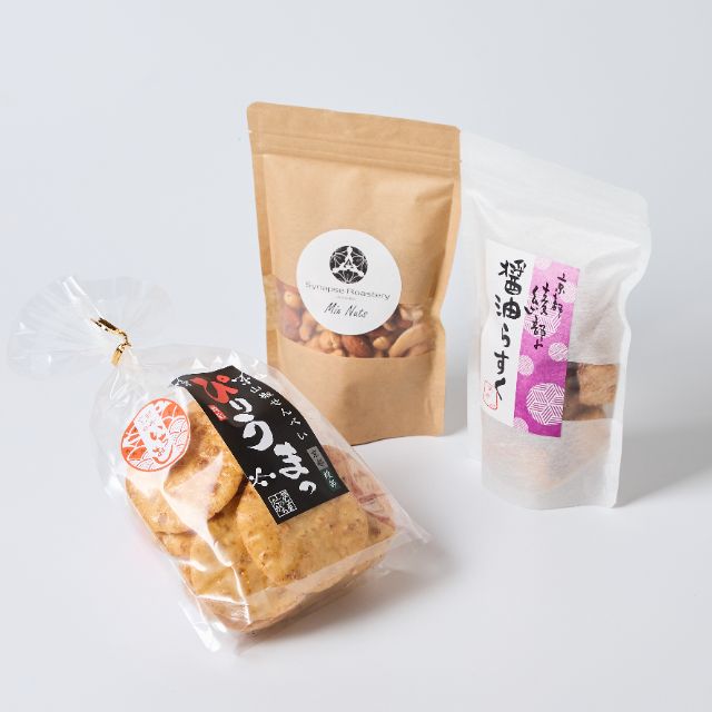 ・山椒せんべい 1袋 ・ミックスナッツ 1袋 ・醤油ラスク 1袋 |