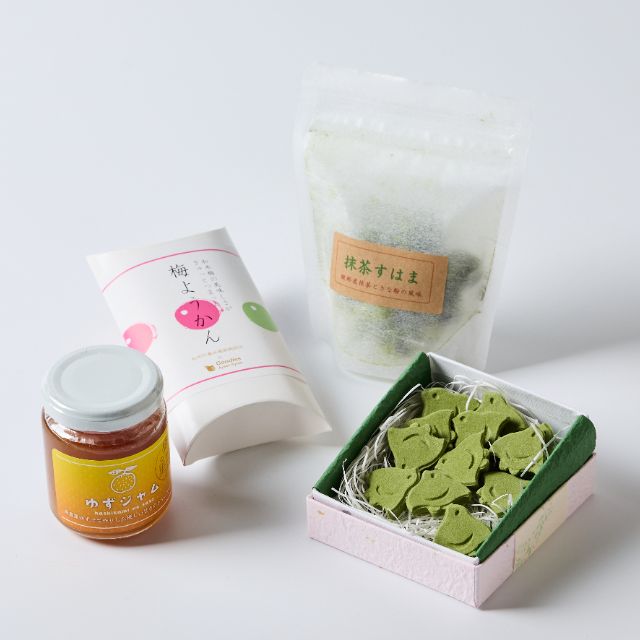 ・抹茶和三盆 1箱 ・梅羊羹 2個 ・すはま 2袋 ・ゆずジャム 1瓶 |