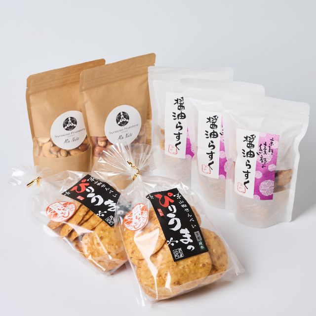 ・山椒せんべい 2袋 ・ミックスナッツ 2袋 ・醤油ラスク 3袋 |