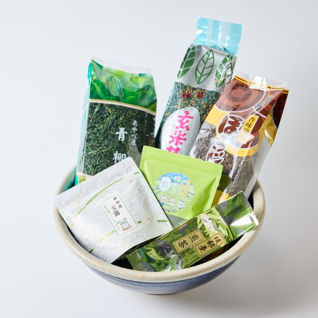 ・玉露(「うじみどり」もしくは「やぶきた」)30g ・煎茶 100g ・青柳 300g ・ほうじ茶 300g ・玄米茶 200g ・抹茶飴菓子 1袋(14個入) |