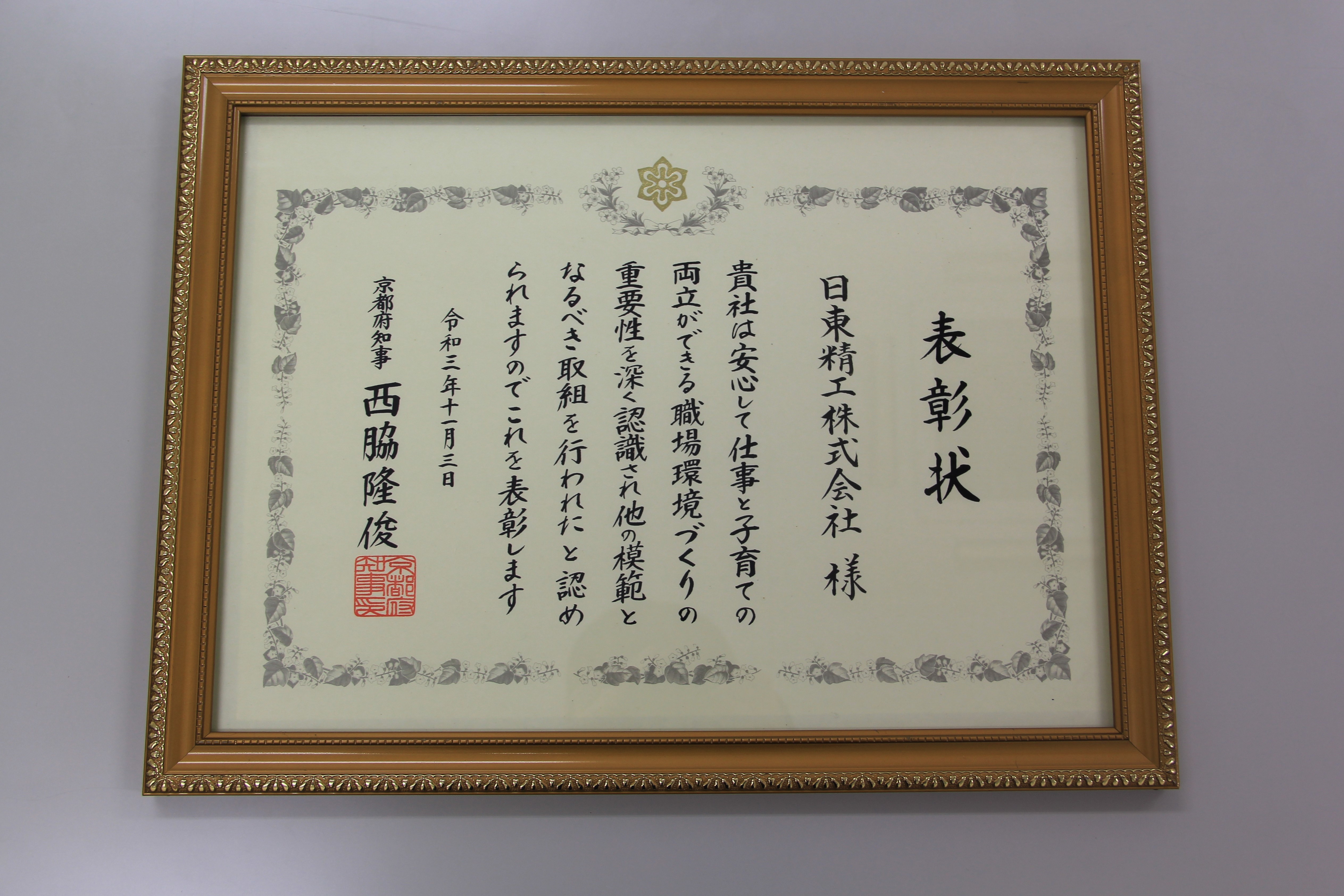 日東精工株式会社(代表取締役社長:材木正己、本社:京都府綾部市井倉町梅ヶ畑20番地、東証1部上場URL:https://www.nittoseiko.co.jp/)は、2021年11月3日に開催された“きょうと子育て環境日本一サミット”の「令和3年度あったか子育てきょうと表彰」において、「子育てにやさしい企業部門」で受賞しましたので、ここにお知らせいたします。