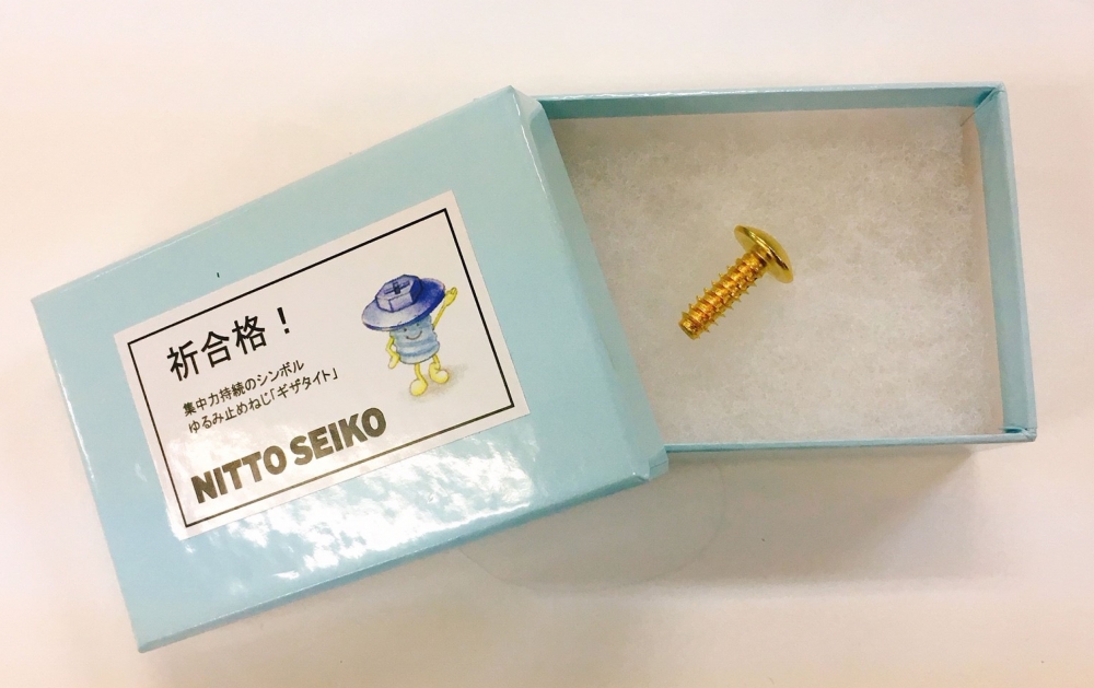 初年度のキャンペーンは準備期間も短かったため樹脂用ゆるみ止めねじ「ギザタイト」を金色にメッキ加工し、箱に要れるというシンプルなものでした。 当社創立77周年を迎え、縁起がいい事から5回に分けてそれぞれ77名にプレゼントしました。(先着順) 合格祈願グッズはお菓子や文具など単なる語呂合わせのようなものも含め多数出回っていますが、「ゆるみ止めねじ」は、これまでになかったものとして、各メディアから注目されるきっかけとなりました。