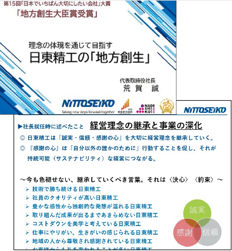 以上のすべてに該当する必要がありますが、日東精工は今年3月に第15回「日本でいちばん大切にしたい会社大賞」の「地方創生大臣賞」を受賞しています。