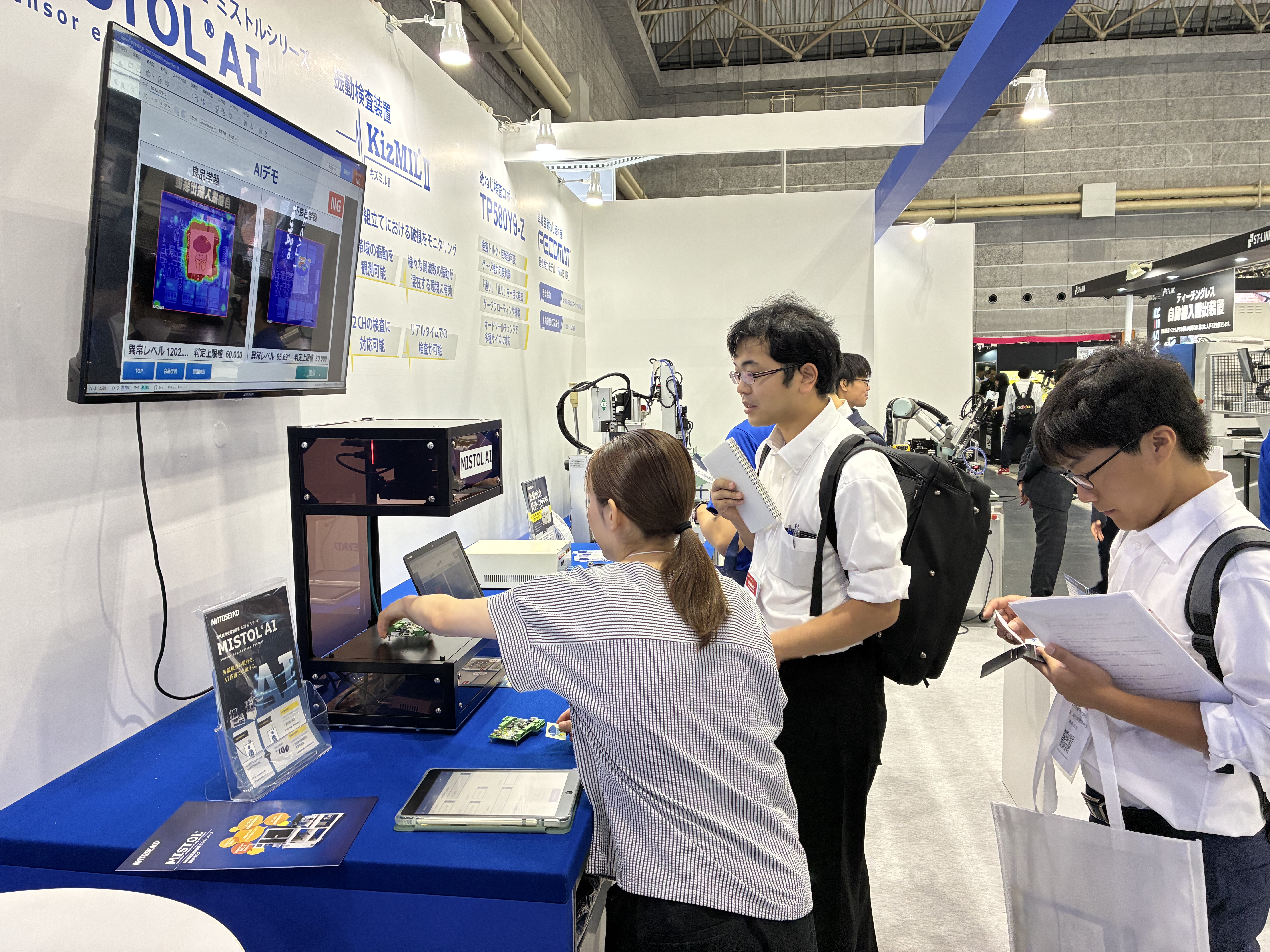 当社のブースでは、①超低推力でのねじ締めを可能とする単軸自動ねじ締め機「FM513VZR」、②高精度なねじ締め作業を可能とする協働ロボット搭載タイプの自動ねじ締め機「FM514CZ」、③トルクを計測してタップ成形の異常を検知する「めねじ検査装置卓上ロボット「SR395DT」、④小物部品を人工知能(AI)で画像解析して寸法・キズの有無などを検査する部品検査選別装置「ミストルAI」、⑤加工・組立の際に発生する振動を監視し、破損の発生と同時に異常を検知する振動検査装置「キズミルⅡ」など、生産現場のあらゆる課題解決に貢献する製品を展示しました。