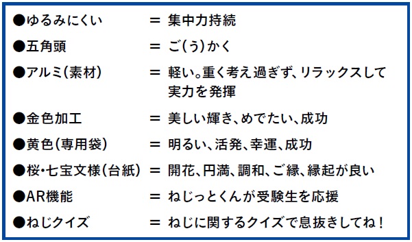 自動車分野など工業用に幅広く使われている当社樹脂用ゆるみ止めねじ「ギザタイト」を、ねじ頭を五角形(=合格)にし「成就」の文字を刻印するなど、ポジティブな意味をたくさん込めた仕様になっています。専用台紙も用意。台紙にはAR機能を加え、スマートフォンの専用アプリで読み込むと、応援メッセージを受け取ったり、「ねじクイズ」にチャレンジできるようになっています。