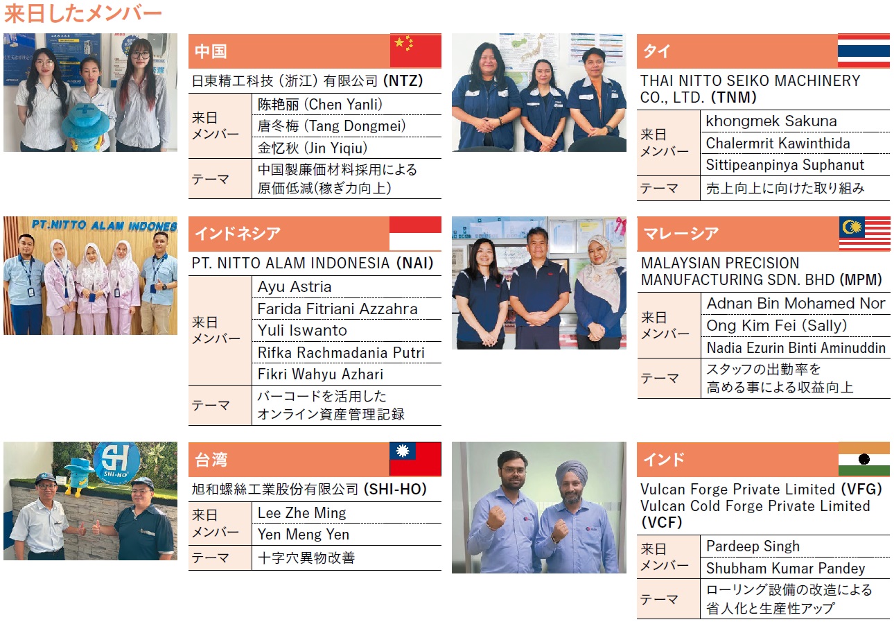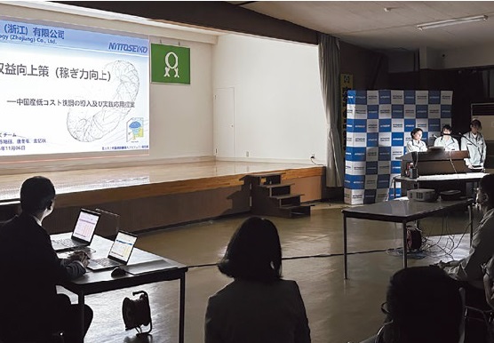 日東精工は「モノづくりの基本は人づくり」という考えのもと、創業以来、人財教育に力を入れており、それは国内だけでなく海外のグループ会社にも浸透しています(各国の発表テーマは次頁参照)。インドのバルカン社は「QC活動」を学びはじめたばかりということで今回はオブザーバーとして参加、残りの5か国・地域で内容を競い合い、最優秀賞には中国NTZが輝きました。「どの国を最優秀としてもおかしくない、ほんとうに僅差でした。日本人には思いもよらない発想の転換があり、さまざまな気づきがあり、学ぶべきことは多かったです」と当社代表取締役会長 材木正己。