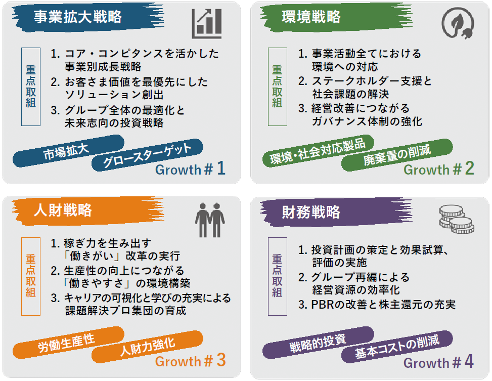 4つの成長戦略(事業拡大・環境・人財・財務)を継承し、さらに深化させていきます。