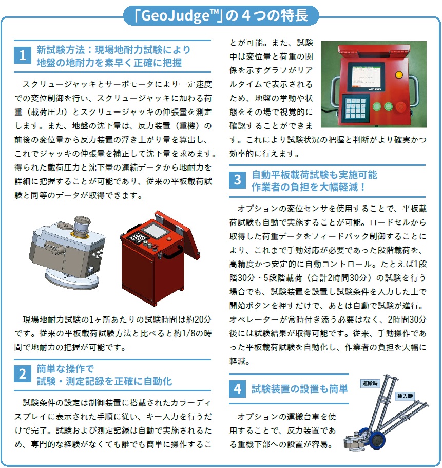 「もっと短時間で地盤の硬さを試験・評価できないか」という声に対応すべく、今般、当社では「現場地耐力試験装置 GeoJudge™」を開発、本年6月から販売を開始します。もともとは厚生労働省所管である「労働安全衛生総合研究所(JNIOSH)」が新しい地耐力調査方法を研究し開発を進めていたものをベースに、当社が量産できるものとして完成させたもの。この「GeoJudge™」では1ヶ所に要する測定時間は約20分、従来の検査にかかる時間をなんと約8分の1と大幅に短縮することができました。もちろん、従来の平板載荷試験と新しい現場地耐力試験との比較実験でも同等の試験結果が得られることも実証済みです。下の囲みで製品の詳細を紹介していますが、正確さと迅速さを併せもつ画期的な地耐力試験装置といえるでしょう。
